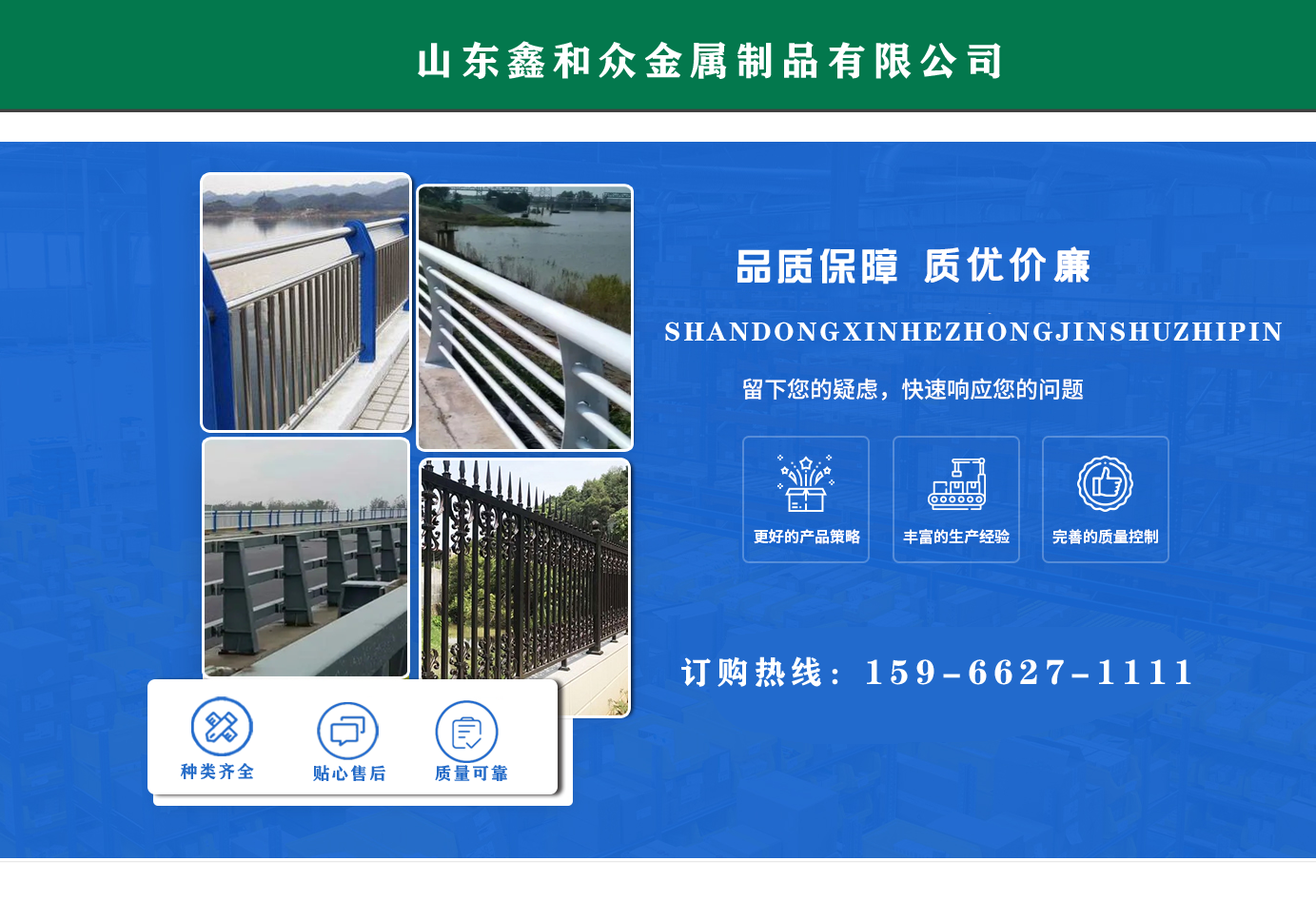 山東鑫和眾金屬制品有限公司主要產(chǎn)品有防撞護(hù)欄,橋梁護(hù)欄,道路護(hù)欄,河道護(hù)欄,不銹鋼護(hù)欄等護(hù)欄。提供設(shè)計方案,一站式定制,包您滿意價格優(yōu)惠,歡迎來電咨詢! 公司常年從事銷售護(hù)欄防撞護(hù)欄,橋梁護(hù)欄,道路護(hù)欄,河道護(hù)欄,不銹鋼護(hù)欄,橋梁鋼護(hù)欄,河道燈光護(hù)欄等。產(chǎn)品廣泛應(yīng)用于橋梁、河道、旅游景區(qū)、道路、公路、公園、小區(qū)、景觀、道路防撞等領(lǐng)域?! 」井a(chǎn)品均采用優(yōu)質(zhì)不銹鋼材料,符合相關(guān)標(biāo)準(zhǔn)。各種型號不銹鋼復(fù)合管及護(hù)欄,質(zhì)量嚴(yán)格把控。產(chǎn)品強(qiáng)度高、耐腐蝕、焊接牢固、抗沖擊、性能好,防撞護(hù)欄結(jié)構(gòu)簡單、美觀實(shí)用大方?! g迎前來訂購!...